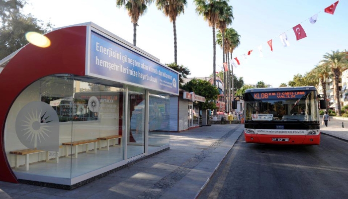 Enerji Günlüğü - Antalya Büyükşehir Belediyesince üretilen güneş enerjisiyle çalışan klimalı otobüs duraklarının ikincisi Cumhuriyet Meydanı'na konuldu. Büyükşehir Belediyesi'nin Boğaçayı Tesisleri'nde ürettiği "Akıllı durak", Cumhuriyet Meydanı'na konuldu. Büyükşehir Belediye Başkanı Mustafa Akaydın ve vatandaşların katılımıyla açılan durakta, güneş enerjisiyle çalışan klima bulunuyor. Sensörlü otomatik kapıyla girilen durakta, telefon ve bilgisayarları şarj etmek için 3 adet priz de bulunuyor.