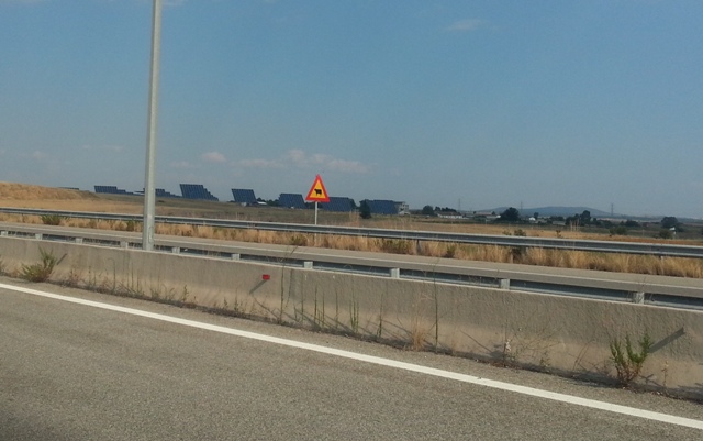 Bir süre gittikten sonra bu kez yolun solunda, yani Ege Denizi yönünde bir güneş tarlası dikkatimi çekiyor. Onun fotoğrafını çekebilmek için otobanda arabayı durduruyorum. Yoldan tek tük araç geçtiği için rahatlıkla fotoğraflıyorum. Hava sıcak. Güneş yakıcı. "Evet" diyorum, "Komşu, bu yakıcı güneşten yararlanmaya başlamış, bizde henüz bir arpa boyu yol gidilmiş sayılmaz bu konuda... "