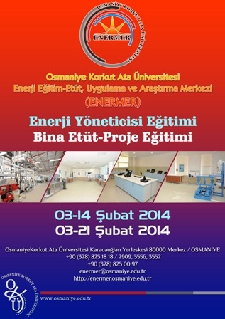 Enerji Günlüğü - Osmaniye Korkut Ata Üniversitesi, Enerji Eğitim-Etüt, Uygulama ve Araştırma Merkezi (OKÜ ENERMER) Enerji Yöneticisi ve Bina Etüt-Proje Eğitimi’ni 03-21 Şubat 2014 tarihleri arasında üniversite bünyesinde gerçekleştirecek.
