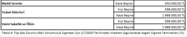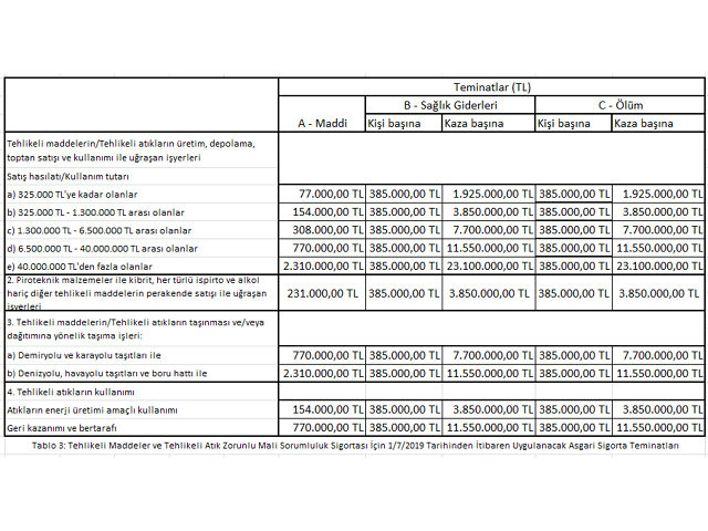 Buna göre tehlikeli maddeler için yaptırılacak zorunlu sorumluluk sigortalarına ilişkin; 2019, 2020, 2021 ve 2022 yıllarında geçerli olacak olan sigorta teminat tutarları aşağıdaki gibi olacak.